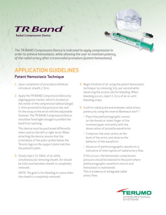 • NOTE: Guidelines are based on compilation of best practices. TR BAND Compression Device removal protocols should be consistent with the needs of the provider(s) and patient. Air injection volume and compression time may differ according to the patient’s condition, anticoagulation, and puncture site size. Check the puncture site frequently and adjust accordingly.