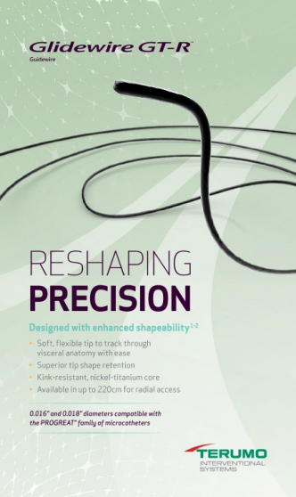 Glidewire GT-R is designed with a super elastic nickel-titanium (Ni-Ti) core and superior hydrophilic coating for enhanced durability and vessel selectivity.1
