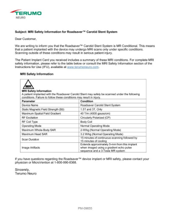 For complete MRI safety information, please consult the MRI Safety information section of the ROADSAVER Stent System Instructions for Use (IFU).